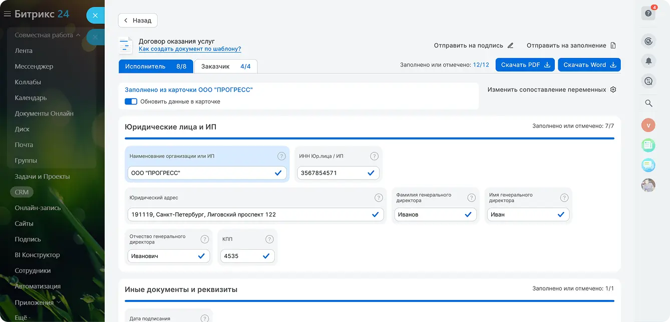 Благодаря собственному редактору в DataDoc можно настроить шаблоны практически любой сложности. Переменные, вариативные блоки, интеграция с ЕГРЮЛ и множество других функций.