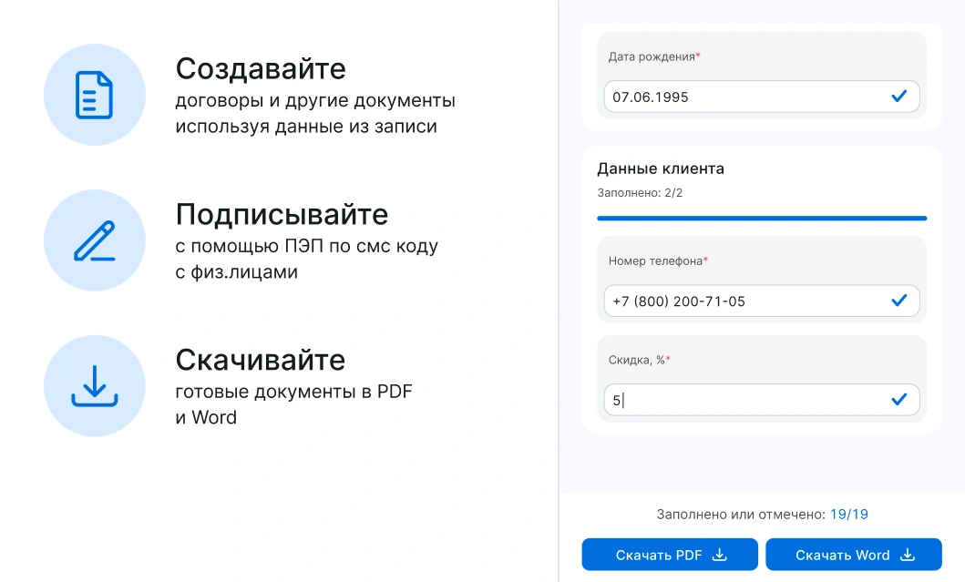 Забудьте о ручном заполнении договоров и согласий! Интеграция DataDoc и YCLIENTS позволяет формировать любые документы прямо из карточки записи клиента. Все данные (ФИО, телефон, состав услуг, стоимость и дата) подтягиваются автоматически.
